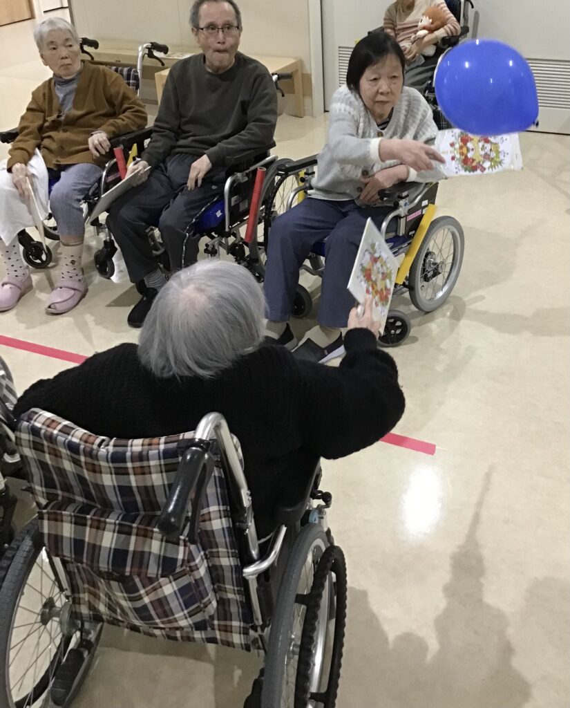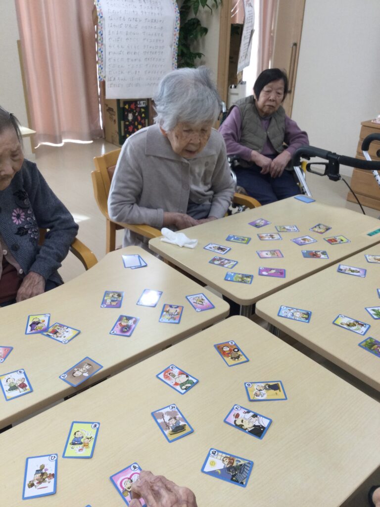 羽根つきでは、グループに分かれて勝負し、いつも以上の白熱具合で盛り上がり、カルタも、「お正月にカルタいいね」と喜ばれ、皆さん真剣に取り組まれていました。