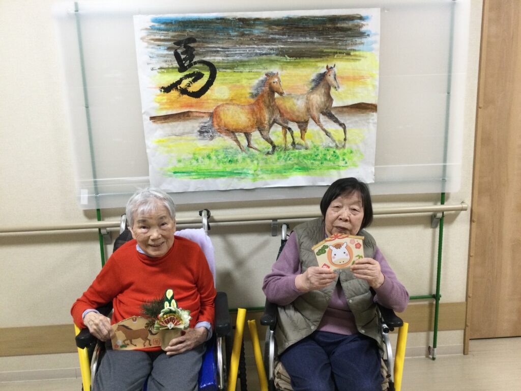 1月行事で、新年会を行いました。絵馬を飾り、羽根つきやカルタをして楽しみました。